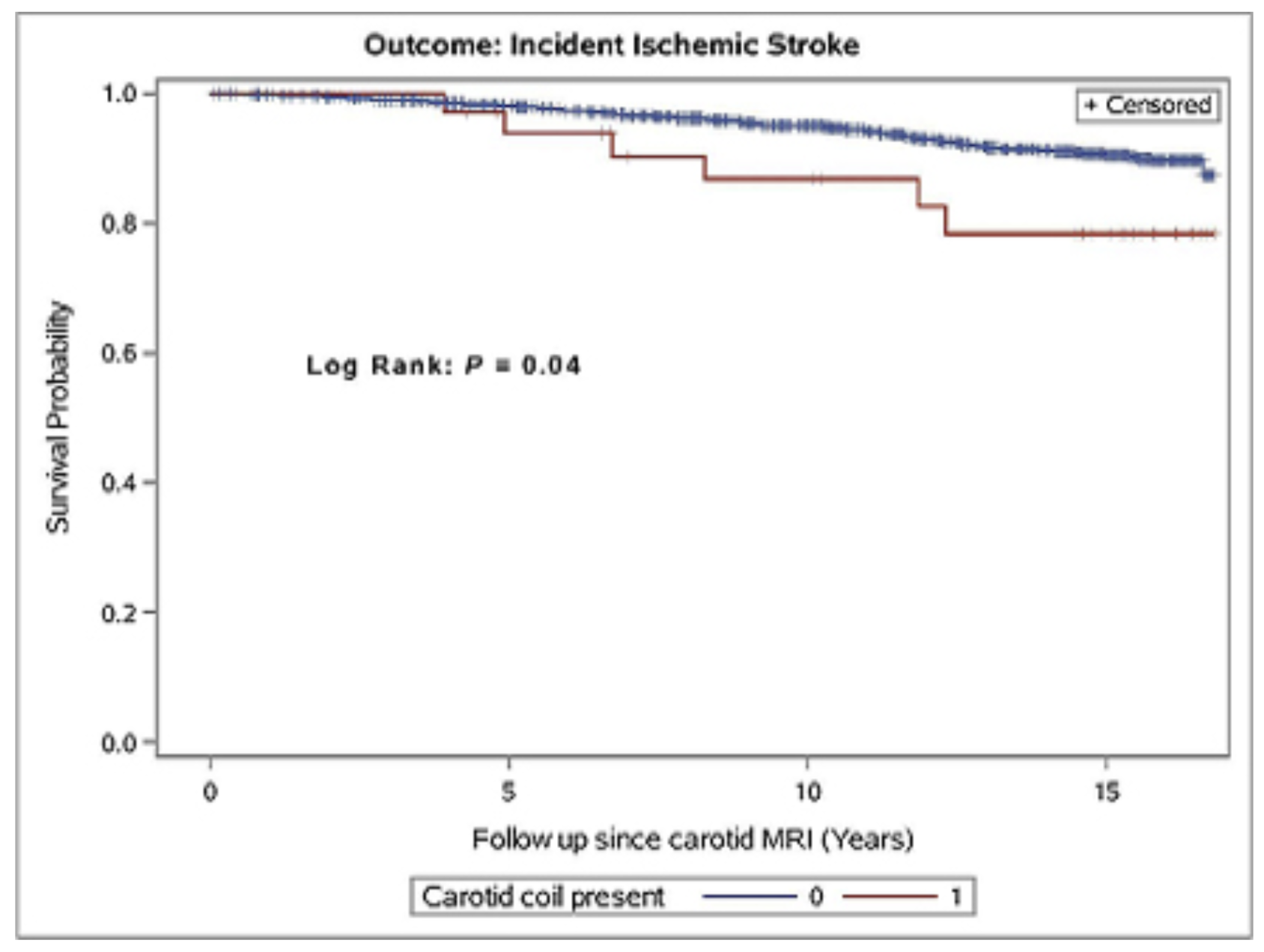 The Cox regression model shows survival probability as a function of the number of years since the MRI was performed. The regression accounted for additional factors that might affect the survival probability, including age, sex, and race, thereby ensuring that carotid tortuosity is the only variable influencing the results. The red line (1) represents either a loop or a kink-shaped carotid artery, while the blue line (0) represents normal tortuosity. Examining the graph, the survival probability of patients with irregular carotid coils declined more rapidly over time than that of patients with regular coils. A p-value of 0.04 (4%) in this study indicates that the results are statistically significant and unlikely to be due to random chance.